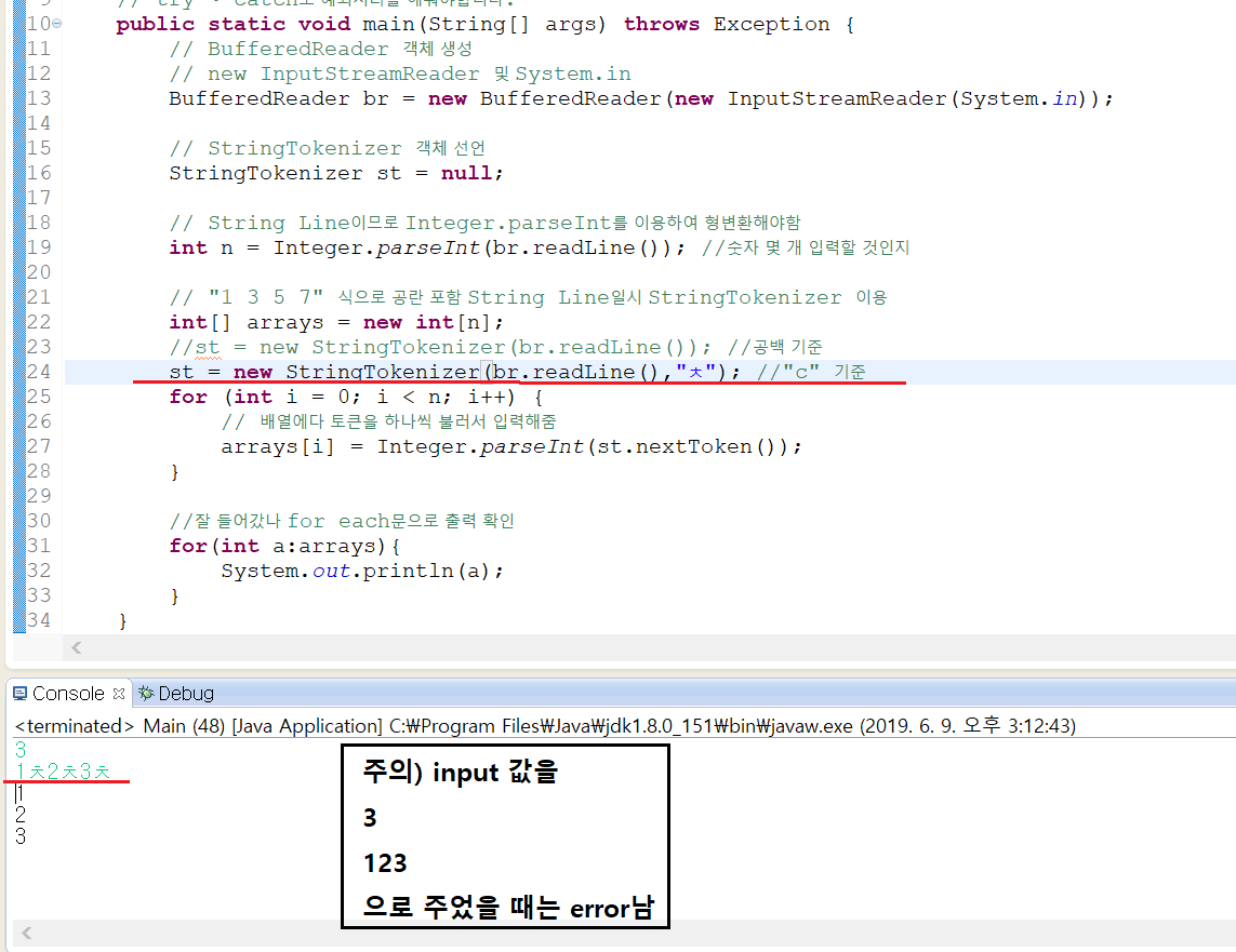 (StringTokenizer는 특정 기준으로 읽게 도와주는 역할을 함), 밑에 코드 주석 참고
